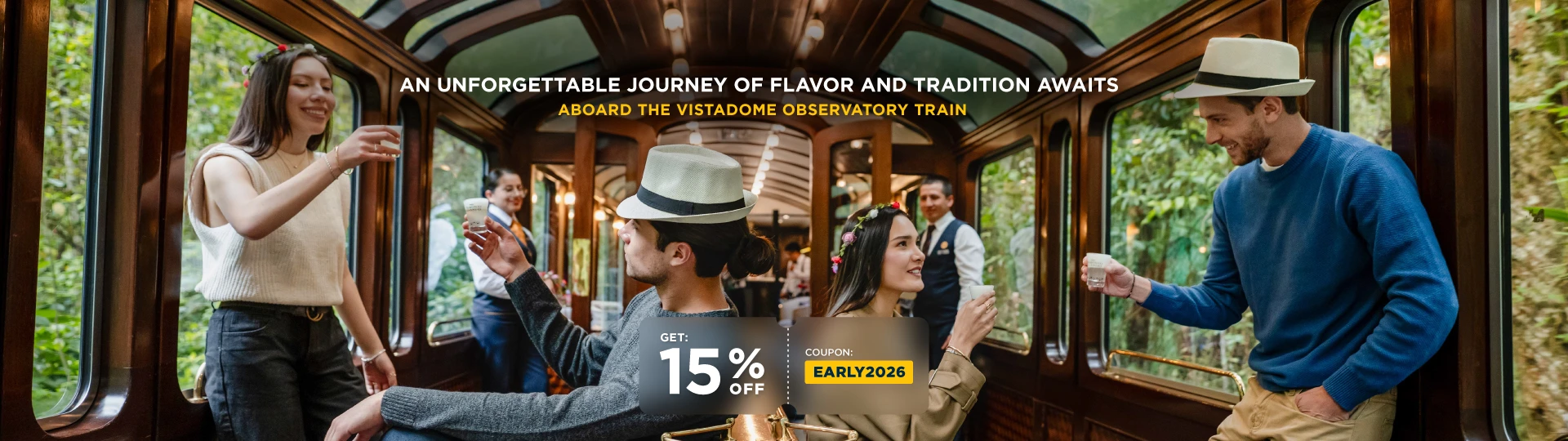 Terms & Conditions: Valid for travel on Vistadome Observatory trains: outbound frequencies: 203, 33, 83 and return frequencies: 204, 34, 604. 15% discount promotion. Frequencies valid for purchase from 10 October to 24 November 2025. Frequencies valid for travel from 6 January to 22 March 2026. Discount code: EARLY2026. Reference exchange rate: S/3.75. Prices include VAT and discount. The promotional fare is per person and subject to availability. Does not apply to children’s fares or group fares. No changes or refunds are permitted. Valid only for new bookings. Transportation to/from stations is not included in the ticket price. Applies to purchases made through www.perurail.com and at points of sale in Cusco and Lima. The passenger declares that they are aware of the validity and conditions of the fare and ticket purchased.