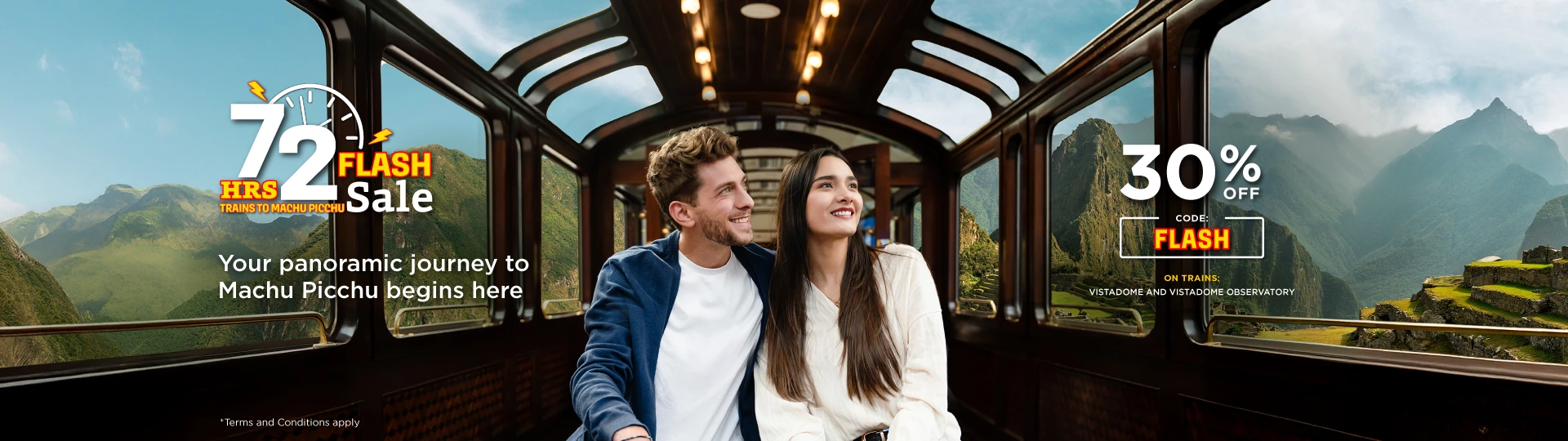 Terms and conditions: Promotion valid for travel on Vistadome and Vistadome Observatory trains. 30% discount promotion. Trains valid for purchase from 15 to 17 November 2025. Frequencies valid for travel from 15 November to 22 December 2025. Discount code: FLASH Reference exchange rate: S/3.75. Prices include VAT and discount. The promotional fare is per person and subject to availability. Does not apply to children’s fares or group fares. No changes or refunds are permitted. Valid for new bookings only. Transportation to/from stations is not included in the ticket price. Applies to purchases made through www.perurail.com and at points of sale in Cusco and Lima. The passenger declares that they are aware of the validity and conditions of the fare and ticket purchased. The passenger may request a refund of the amount paid or a change in service only in the event of non-compliance by PERURAIL, lack of suitability or exercise of the right of withdrawal, in accordance with the provisions of Law No. 29571.