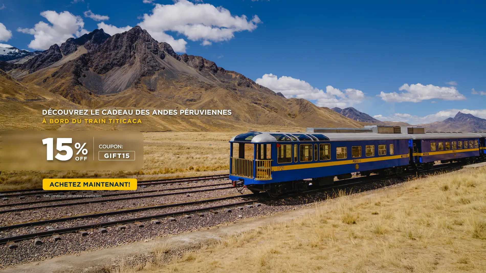 Découvrez la magie d’un voyage entre Cusco et Puno à bord du train PeruRail Titicaca. Profitez de paysages exceptionnels, d’un service haut de gamme et de 15 % de réduction. Offrez une expérience inoubliable pour Noël !