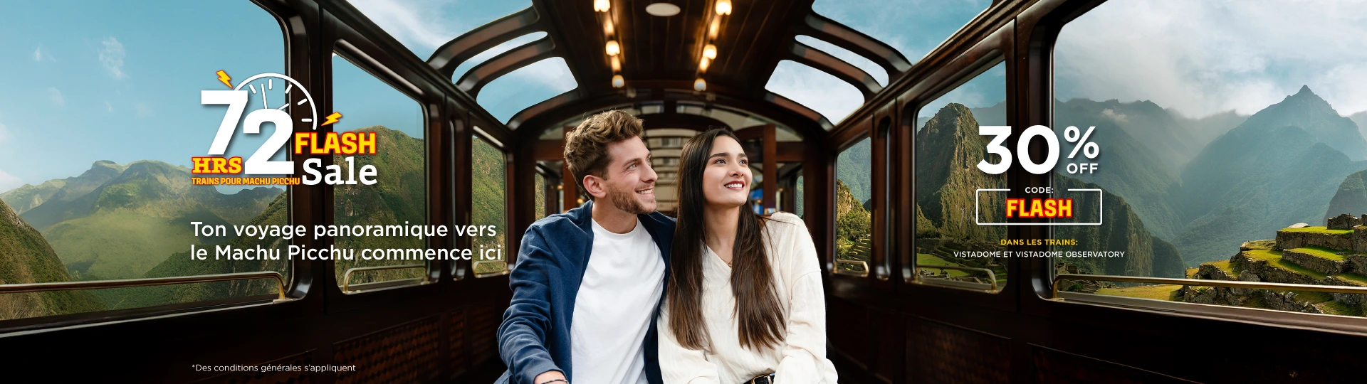 Voyagez à Machu Picchu à bord de nos trains panoramiques Vistadome et Vistadome Observatory avec 30 % de réduction. Ne laissez pas l’année se terminer sans vivre cette expérience unique !