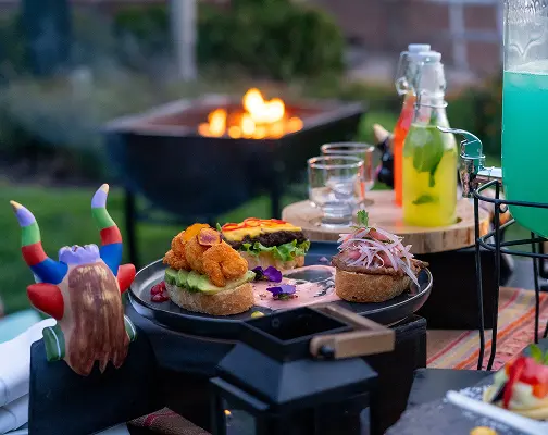 - Mesa alta com petiscos doces e salgados e estação de bebidas.