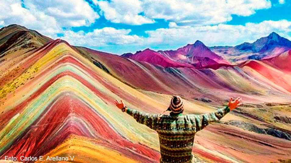 A imponente montanha Vinicunca exibe essas tonalidades devido à erosão das pedras sedimentares, formadas naturalmente, sem intervenção humana, parecendo um arco-íris terrestre. Localizada na cordilheira de Vilcanota, Vinicunca se encontra entre 4.710 e 5.200 metros acima do nível do mar.