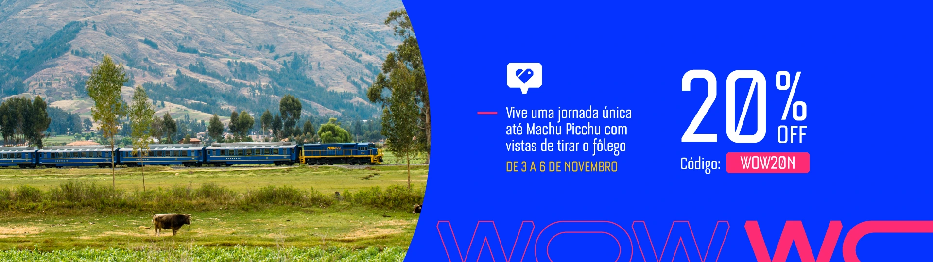 Termos e Condições: Válido para viagens nos trens Vistadome 31, 73, 75, 301, 76, 84, 304, 606 e Vistadome Observatory 83, 303, 302, 504, 604. Promoção com 20% de desconto. Válido para compras de 03 a 06 de novembro de 2025. Válido para viagens de 04 de janeiro a 16 de março de 2026. Código promocional: WOW20N Taxa de câmbio referencial: S/3,75. Os preços incluem IGV e desconto aplicado. Tarifa promocional por pessoa, sujeita à disponibilidade. Não se aplica a tarifas infantis nem de grupos. Não são permitidas alterações nem reembolsos. O consumidor poderá solicitar o reembolso do valor pago ou a alteração no serviço apenas em caso de descumprimento por parte da PERURAIL, falta de adequação ou exercício do direito de arrependimento, conforme estabelecido na Lei nº 29571. Válido apenas para novas reservas. O transporte de/para as estações não está incluído no valor do bilhete. Válido para compras em www.perurail.com e nos pontos de venda em Cusco e Lima. O passageiro declara estar ciente das condições e validade da tarifa e do bilhete adquirido.
